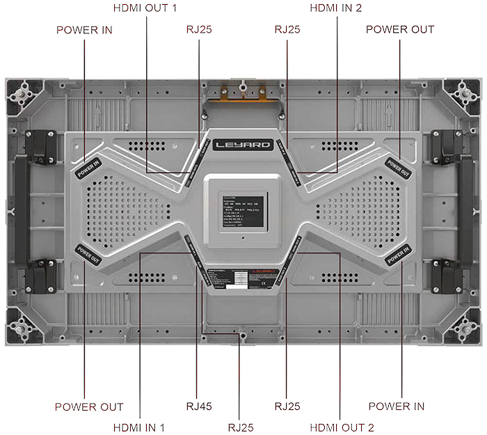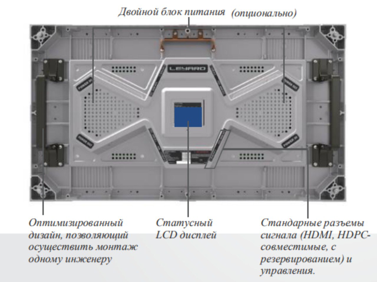 Резервирование сигнала - каждый кабинет оснащен двумя интегрированными разъемами HDMI с проходными каналами, обеспечивается HDCP-совместимость;