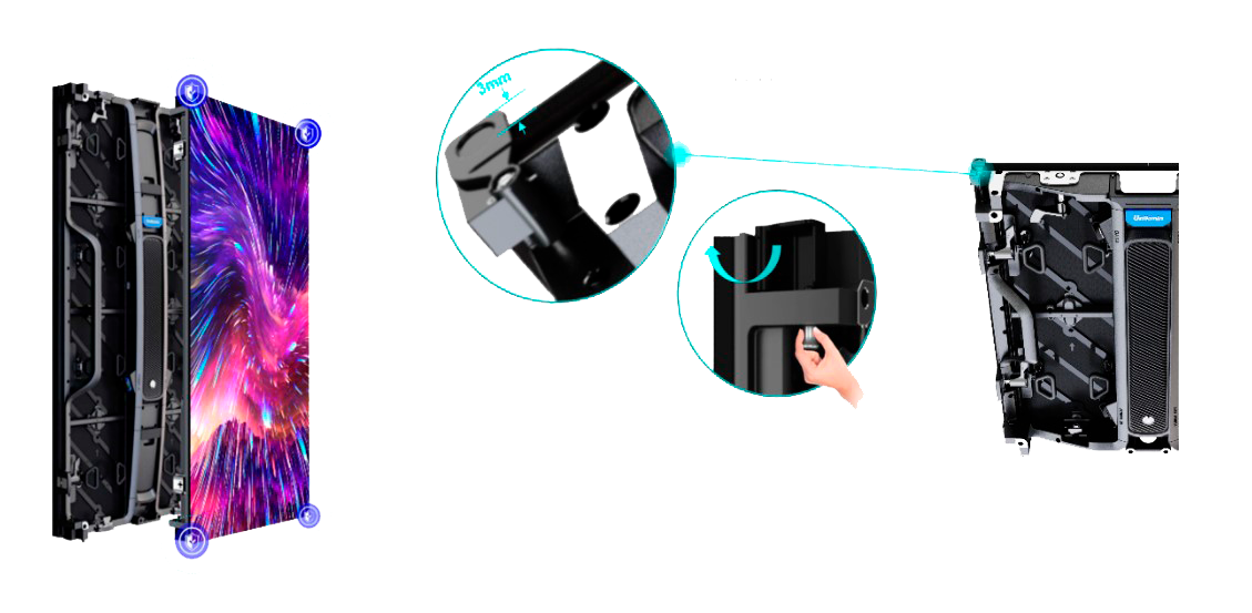 При сбое питания, сбое шнура питания или неисправности авиавилки соседние шкафы будут распределять выходной ток, чтобы обеспечить нормальное отображение экрана.